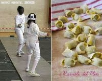Mai come questa volta la tentazione di scegliere questa seconda possibilita' e' stata forte, per me. Diciamoci la verita': ormai, cosi' come succede per la pizza ...o per le crepes....o per i sandwich, nel ripieno di ravioli e tortelli c'e' finito davvero di tutto!! Trovare un'idea originale, ma che sia anche gradevole al palato ed equilibrata nella scelta degli ingredienti, che sia innovativa senza per questo snaturare la ricetta originaria, che sia anche rispettosa della tradizione che solitamente sta dietro questi grandi piatti della gastronomia italiana o internazionale, lo capite anche voi che non e' mica facile! a complicare ulteriormente la cosa, ci sono le realizzazioni degli sfidanti, che immancabilmente mi fanno cascare braccia e mandibola, perche' mi soffiano gli ingredienti da sotto il naso, ma non solo: li abbinano e li combinano molto meglio di come avrei fatto io! Alla fine, non rimane che buttarsi nella mischia....e magari accorgersi di non avere la rotella per tagliare la pasta e nemmeno un tritacarne o un mixer per tritare il ripieno, ma fa niente, non importa: tiremm innanz...ci sono i coltelli, no? Usiamo quelli! A proposito di tirare, saro' anche stata sprovvista di rotella e tritacarne, ma fortunatamente avevo la macchinetta della pasta, la mia fida vecchia Titania compagna di mille sfoglie...perche' va bene l'affetto per l'MTC e il desiderio di onorare la sfida proposta da Elisa, ma, come suol dirsi, a tutto c'e' un limite ed il mio limite arriva al mattarello, questo sconosciuto....